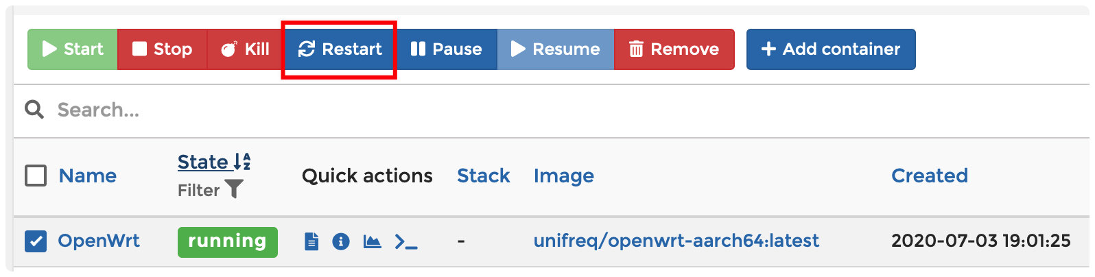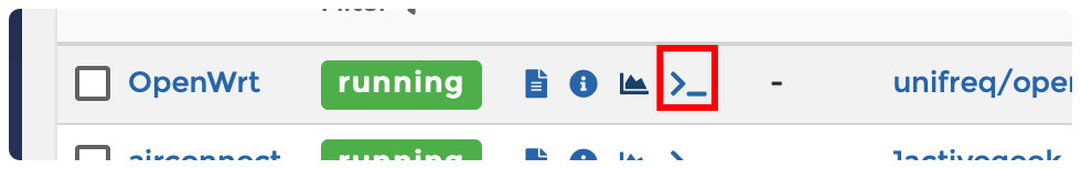 2.4.3 Containers找到OpenWrt点击Quick Action中最右边的按钮