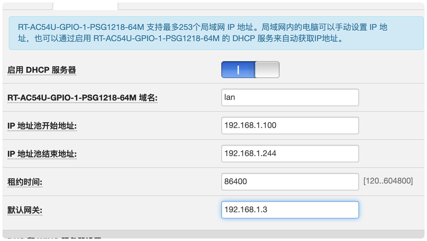 以老毛子系统为例:内部网络(LAN) -> DHCP服务器,在默认网关中填入 2.3 中设置 的 IP,其它不动: